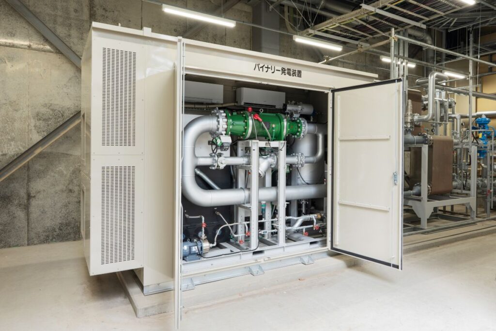 焼却施設の冷却水を利用したバイナリー発電。96℃以上の温水で低沸点の代替フロンを蒸発させタービンを回しています。